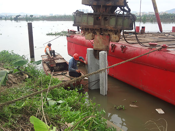 港口鎮(zhèn)中小河流綜合整治工程1項(xiàng)目區(qū)進(jìn)行U型板樁試樁